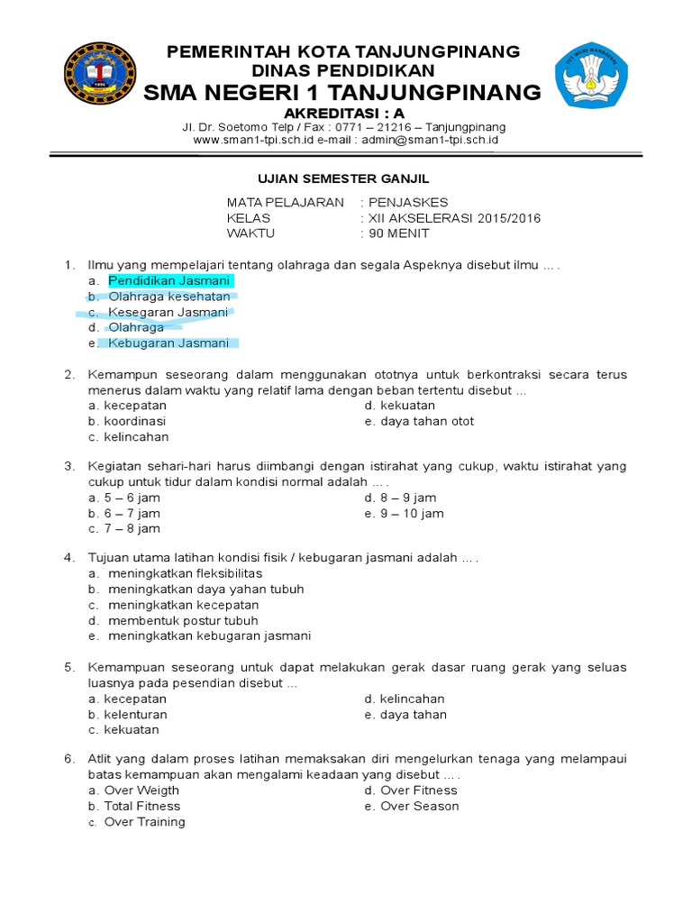 Soal kunci jawaban penjas kebugaran jasmani full materi Jawaban Soal Kebugaran Jasmani 1 A 11 A 21 B 31 E 41 B 51 D 61 B 2 E 12 B 22 B 32 C 42 E 52 B 62 B 3 E 13 D 23 A 33 E 43 B 53 E 63 A 4 D 14 A 24 A 34 B 44 C. Materi Penjas SMA Kelas XII Untuk dapat hidup dengan sehat tentu harus menjaga kesehatan jasmani kita agar tetap bugar dengan cara berolahraga. Jumiati adalah untuk meningkatkan kesegaran jasmani dan kemampuan ergosistem tubuh.