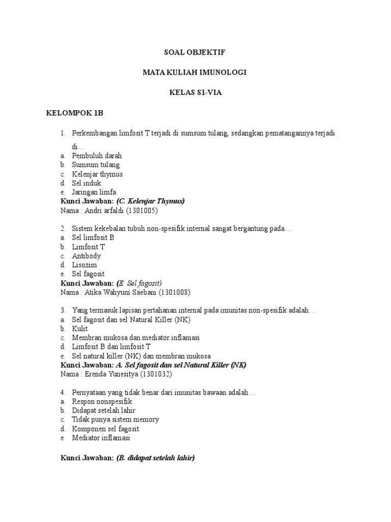 Soal Objektif Imunologi Kelas Si Via